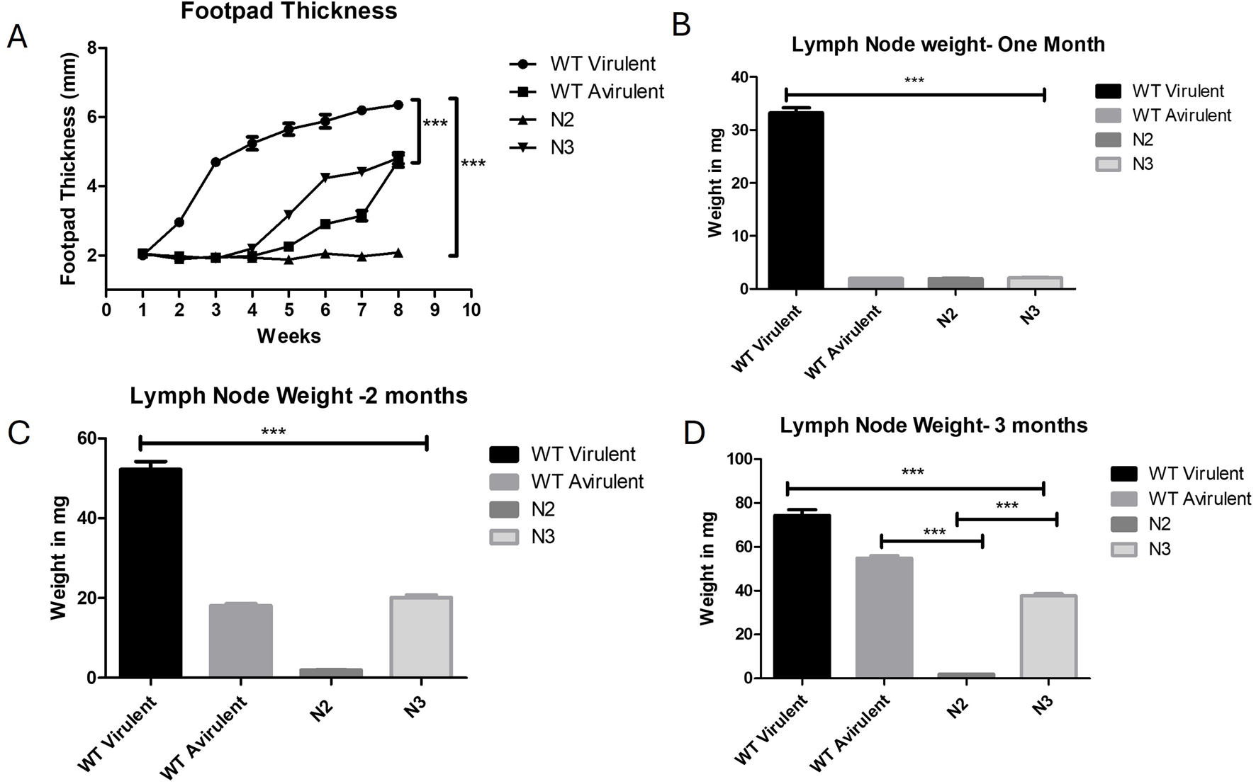 Loss of virulence in N2 KO strain and development of infection in mice. (A) Foot pad thickness was measured for 8 weeks, per week post infection. No foot pad swelling was observed in the N2 infected mice. Five mice were taken for each time point and infection was given in both the hind foot pads (n = 10) ***, P < 0.001 (Two Way Anova). (B) Draining lymph node weight was measured at 1 month, (C) at 2 months post infection and (D) at 3 months post infection. Significantly increased lymph node weight was observed in WT mice in all 3 months post infection when compared with other groups (***p < 0.001). N2 strain infected mice. lymph node showed unaltered weight over the period of 1 to 3 months and remained constant when compared with WT mice (***p < 0.001). At 3 months post infection, WT virulent and N3 mice showed increased lymph node weight significantly increased when compared to N2 mice (***p < 0.001). Data are represented by mean ± SD, n = 10 (One Way Anova).