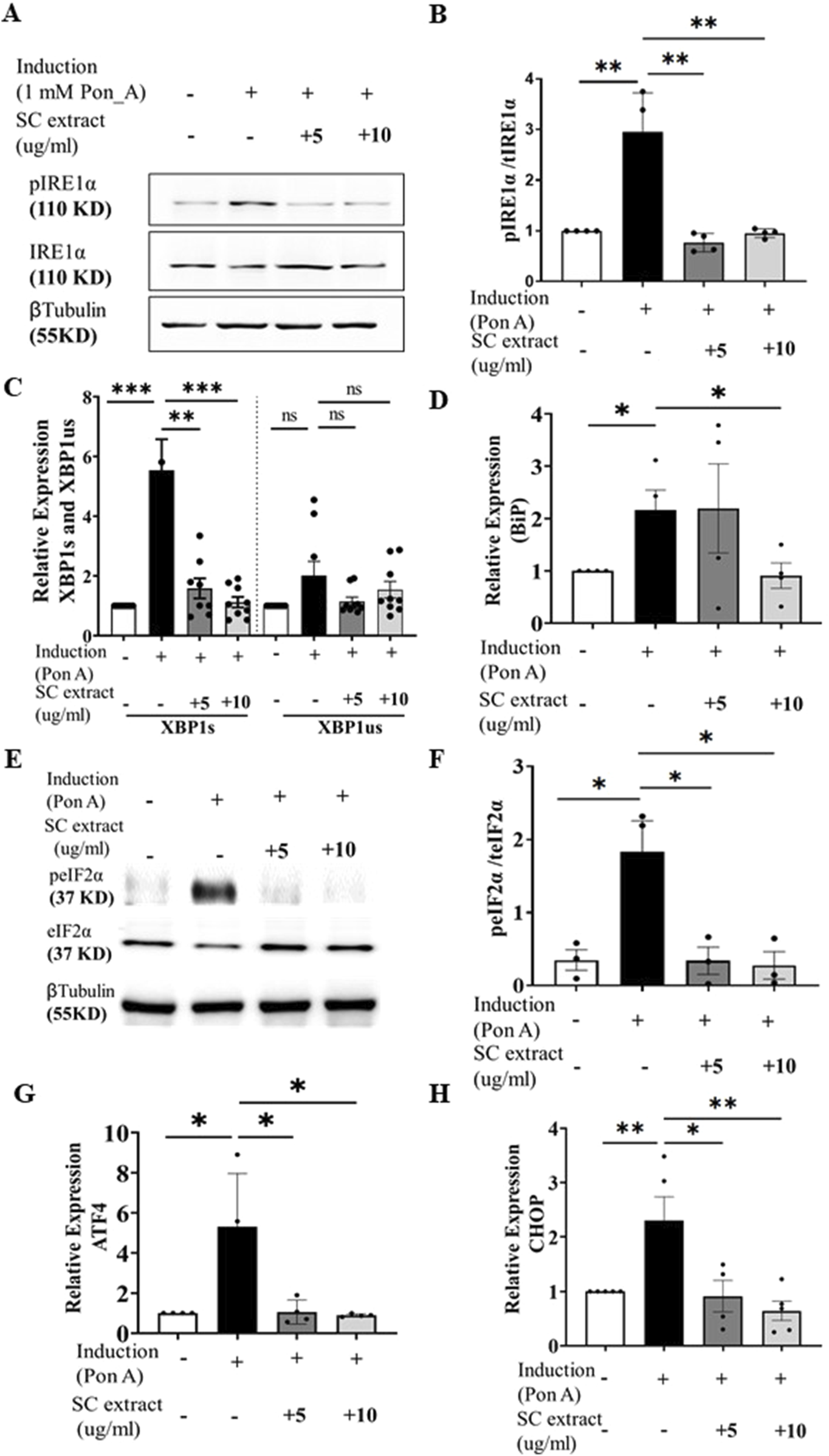 SC modulates ER stress pathway. (A) immunoblots of pIRE1α and IRE1α (Β) and its quantification (n = 4 for all conditions) (C) Relative expression of XBP1s and XBP1us (n = 8 for all groups except SC10µg where n = 9) (D) Relative expression of bip (n = 4, for all conditions) (E) Representative Immunoblot of pEif2a and total Eif2a, (F) its quantification n = 3 for all condition), (G) Relative expression of ATF4 (n = 4 for all conditions) and (H) CHOP. (n = 4 for all conditions) (All data represented as mean ± SEM, *p < 0.05. **p < 0.01, ****p < 0.001 and ns is statistically non-significant).