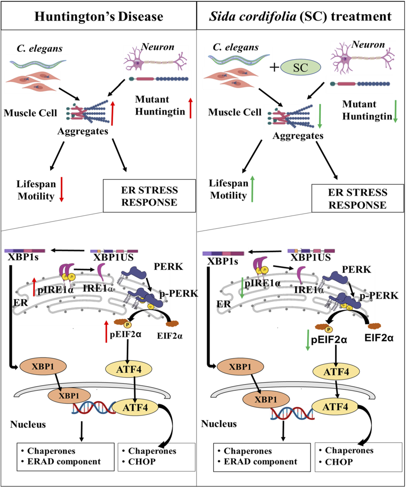 Sida cordifolia is efficacious in HD models by reducing ER stress. Reduces the aggregates in transgenic HD worm model expressing mutant protein (Q40::YFP) in their body wall muscle. This improves motility and enhances the lifespan of these worms. In neuroblastoma cells (N2a) expressing polyQ-EGFP SC treatment reduces the amount of mutant protein and thereby reducing the number of aggregates. This is accompanied by reduction in levels of key ER stress markers - Spliced XBP1s, pEIF2α and pIRE1α.