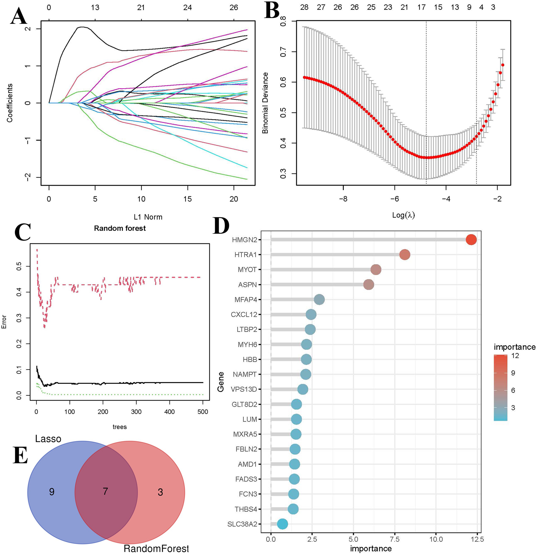 Identification of biomarkers using machine learning. (A) LASSO coefficient path plot, each curve represents the trajectory of a biomarker, with the vertical axis indicating gene values, the lower horizontal axis representing log(λ), and the upper horizontal axis showing the number of nonzero biomarkers in the model. (B) Ten-fold cross-validation plot for LASSO regression. (C) Relationship between the number of decision trees and error rate in the RF algorithm. (D) Bar plot of feature gene importance in the RF model. (E) Venn diagram of key biomarkers identified by both methods.