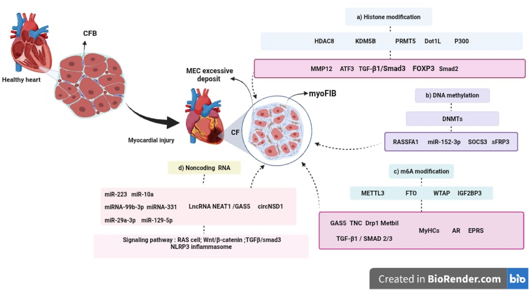 In response to cardiac injury, CFBs become activated, proliferate, and differentiate into cardiac myofibroblasts (myoFIBs). This phenotypic transition is associated with the upregulation of fibrotic markers, including COI I, COI III, alpha-smooth muscle actin (α-SMA), and fibronectin. Accumulating evidence indicates that various epigenetic modifications play a key role in regulating the activation, proliferation, and fibrogenic behavior of CFBs, as well as the expression of proteins that characterize the fibrotic cardiac phenotype.