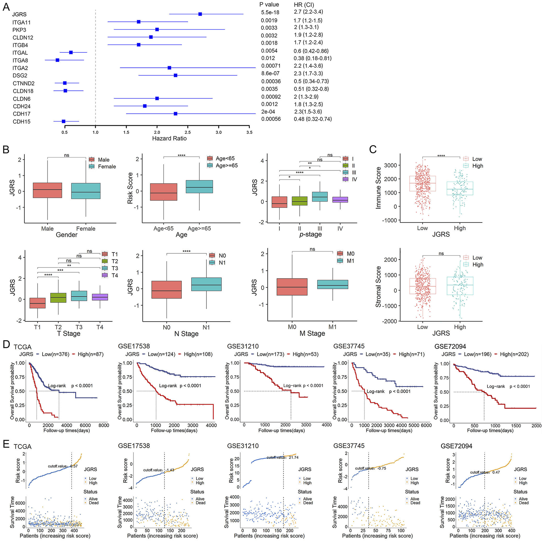 Figure 4. The JGRS can distinguish different clinicopathological features of LUAD. (A) A forest plot of the univariate Cox regression analysis of JGRS and 14 genes that were chosen for establishing a prognosis signature. (B) Different analyses of JGRS distribution based on sex, age, p-stage, as well as T, N, and M stages in TCGA cohort. (C) Distribution of immune and stromal scores between low- and high-JGRS groups in TCGA cohort. (D) Kaplan-Meier survival curves based on the JGRS in TCGA and four GEO cohorts. (E) JGRS distribution in TCGA and four GEO cohorts.