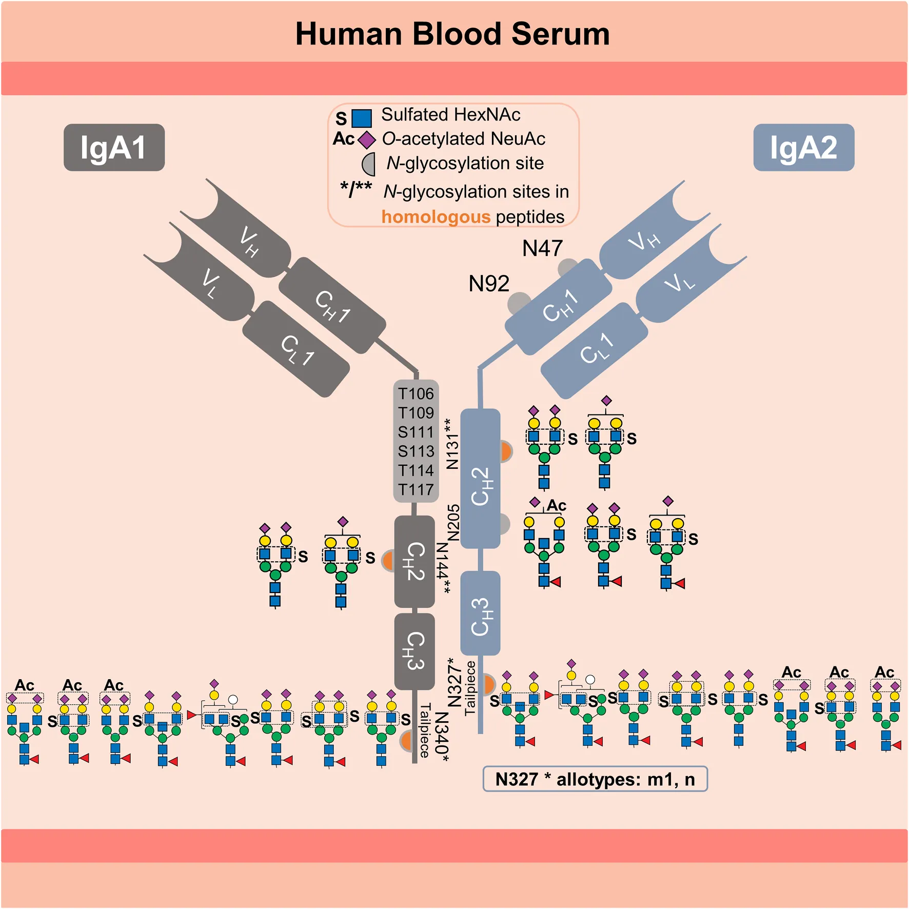 immunoglobulin A (IgA), mass spectrometry, glycoproteomics, N-glycosylation, oxonium marker ions, sulfated N-glycans, O-acetylated N-glycans, rare N-glycans