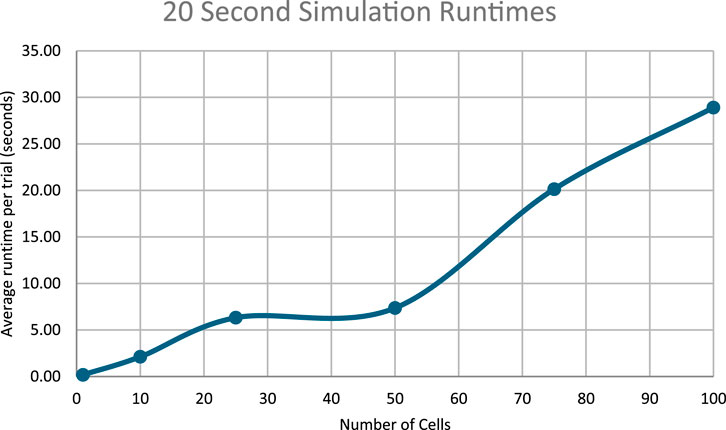 The simulator was then run with these conditions, simulating 1, 10, 25, 50, 75, and 100 cells, with the number of cells acting as the independent variable and the results of the single cellular simulation being the control against which the multicellular simulations will be compared. For each number of cells, two simulations were run for 20 s and 50 s for 50 trials each. 20 s and 50 s were chosen as the simulation time limits primarily to expedite experimentation, as the values provided distinct results while allowing sufficient observation of the evolution of the simulated systems.