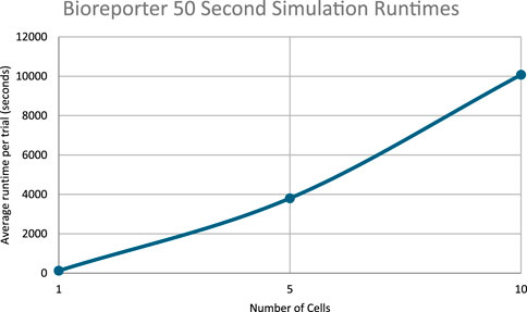 Figure 2 indicates that the total amount of reporter proteins present in all cells at the end of 20 s of simulation time increases as the number of cells being simulated increases, with each multicellular simulation yielding statistically significant results compared to the unicellular simulation. This validates the hypothesis that multicellular simulations would yield significantly different results than unicellular simulations at the population. This trend is a natural consequence of accounting for more reporter protein to the total amount counted by including more cells in the total amount counted, and the trend is similar to how real bacteria must coordinate with each other to produce a visible glow in certain bioluminescent organisms, as single bacteria produce much less light than a colony (Smith and Grima, 2018). This graph does demonstrate that the dilution effect amongst multiple cells does not outweigh the increased reporter protein production caused by the presence of more cells and therefore greater capacity for reporter protein production. The upward trend suggests multicellular bioreporters are a promising candidate for better bioreporter signal strength. However, the graph does not increase linearly with the number of cells added, as might be naively expected of increasing the capacity for reporter production. The nonlinearity shown in the graph demonstrates the importance of actually simulating multiple cells when considering multicellular systems instead of simulating a single cell and multiplying its results by the number of cells in the system that is supposed to be simulated. If that were done here, the graph of those results would be perfectly linear, and an overestimate of the real results obtained from realistically simulating multiple cells. It is worth noting, however, that simulation of multiple cells is much more computationally intensive than approximations like scaling up the results of a single celled simulation. Future work would include optimizations to the algorithm used in this project for less prohibitive runtimes and better scalability on parallel architectures. Future work would also include comparison of different methods of approximating multicellular simulations with less complexity. For example, an analysis of how the results and runtime of a scaled single cellular simulation differs from a true multicellular simulation under different conditions could be performed. Similar analysis could also be performed on a simulation approximating a multicellular system as one large cell with modified amounts of DNA and membrane diffusion rates. Future work could even include tuning these approximations to find the best balance between accuracy of results and brevity of runtime.