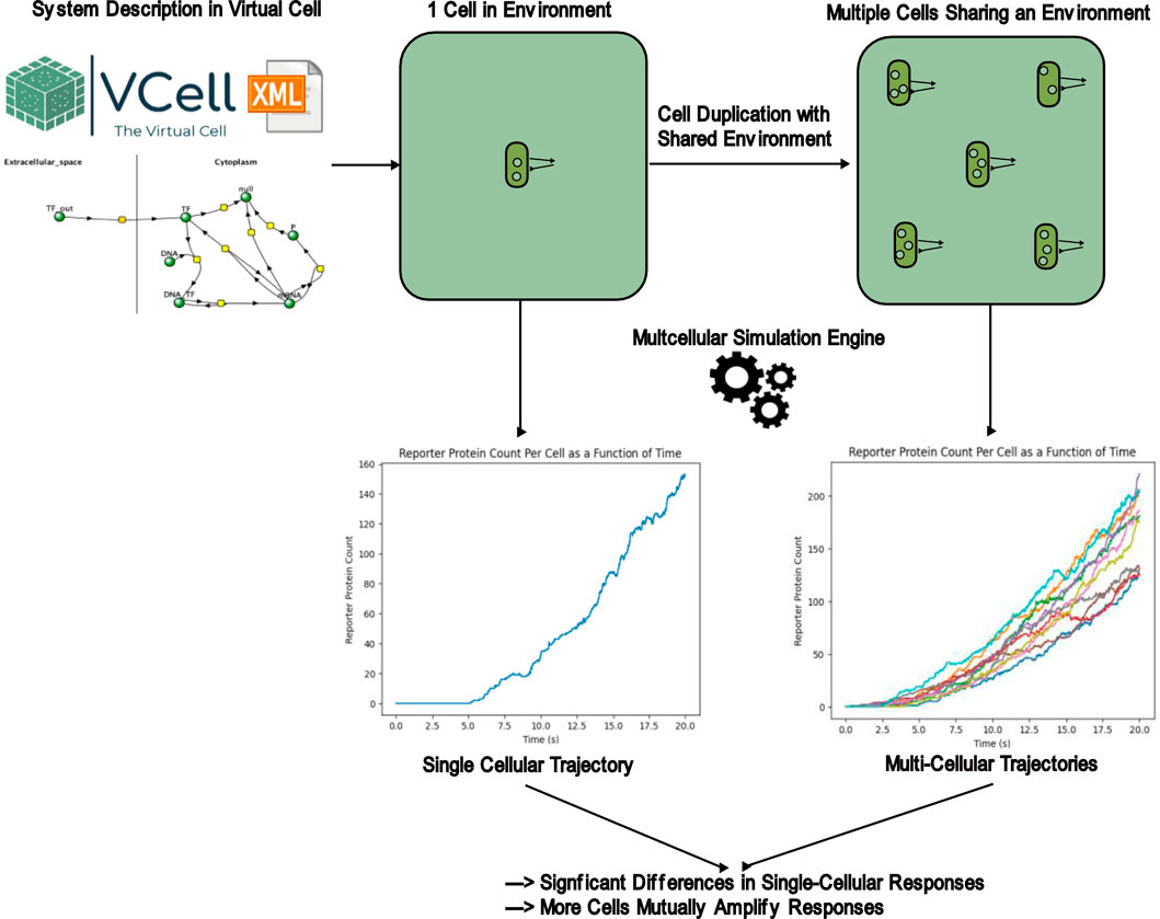 Methods: In this work, a multicellular simulator implementing the Gillespie algorithm and compatible with Virtual Cell-designed networks is created and used to demonstrate nuances to multicellular stochastic simulations. The algorithm was used to simulate multiple cells in a reaction network in which a self-promoting and membrane permeable transcription factor also induces production of a cell-bound reporter protein. A proof-of-concept bioreporter that responded to an environmental analyte while leveraging intercellular interactions for signal production was also designed and simulated for 50 s of simulation time. Simulated systems with multiple cells were compared to single-cellular simulations.