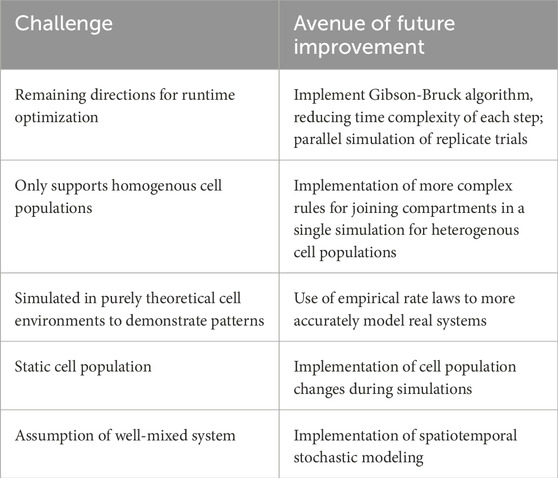 The algorithm was implemented in the Python (3.11.8) programming language and uses the Numba (v0.59.0) and Numpy (v1.26.0) libraries for runtime optimization. All code was written in a Jupyter notebook and run locally on a Macbook M2. Multicellularity was achieved by duplicating the intracellular cellular environment so that they all shared the same species in the extracellular environment. Thus, we reproduce a homogenous cell population within a shared environment.