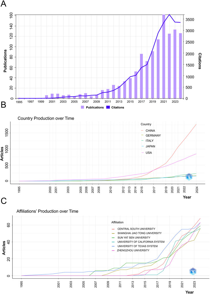 Figure 1. Trend chart of annual publication volume and citation frequency. (A) Annual trend in publication volume and citation frequency; (B) Timeline of countries; (C) Trend of publications by institution over time.