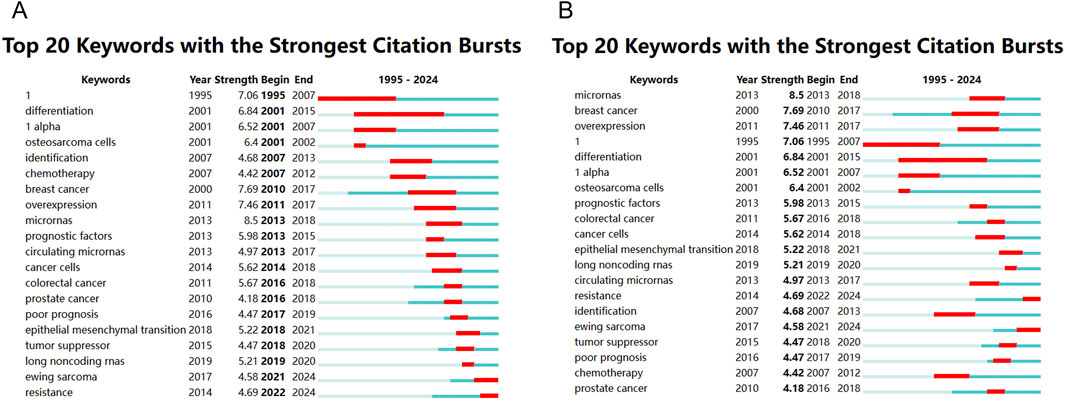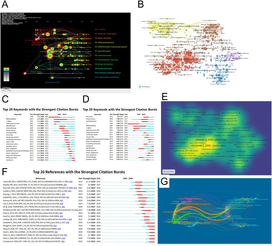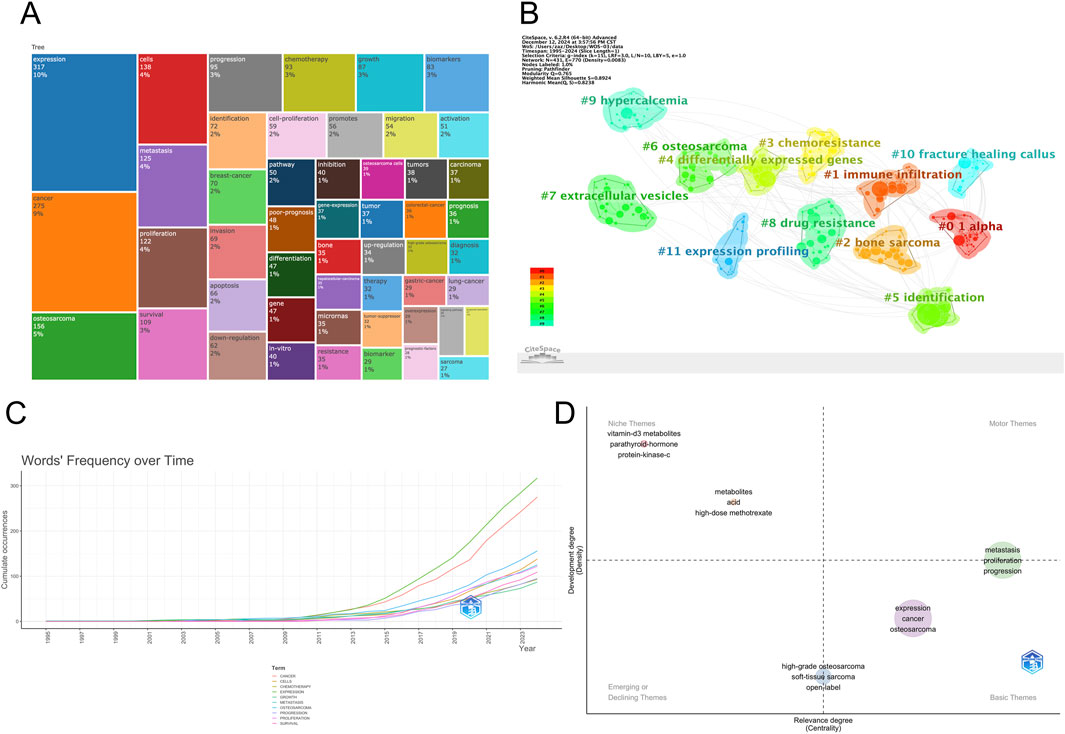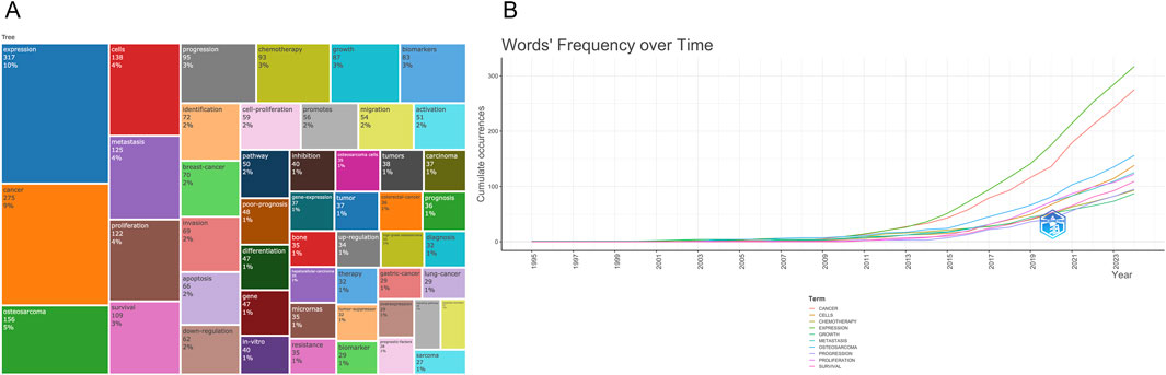 The treemap diagram (Figure 8A) visualizes keyword categories based on frequency and hierarchical structure. Categories such as “cancer” “expression” “cells” and “proliferation” occupied the largest blocks, reinforcing their central importance. Meanwhile, topics like “drug resistance” “microRNAs” and “tumor suppressor genes” emerged as smaller but growing areas. Temporal trends in Figure 8B show a sharp rise in cumulative usage of terms such as “cancer” “osteosarcoma” “expression” and “biomarkers” since 2015. Terms like “microRNAs” “exosomes” and “chemotherapy” also showed accelerated growth in recent years, suggesting an expanding interest in non-coding RNA regulation and treatment-related metabolic dynamics. Collectively, these keyword analyses reveal that the field is evolving from basic molecular characterization toward more integrated themes such as therapeutic response, tumor microenvironment, and personalized biomarker development. The diversity and convergence of keyword clusters also indicate an increasing complexity and maturity in the research landscape.
