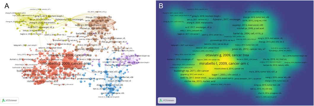 Figure 12. Literature co-citation analysis and density visualization. (A) Analysis of co-citations in literature; (B) Density visualization diagram.