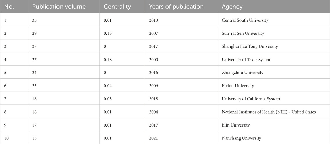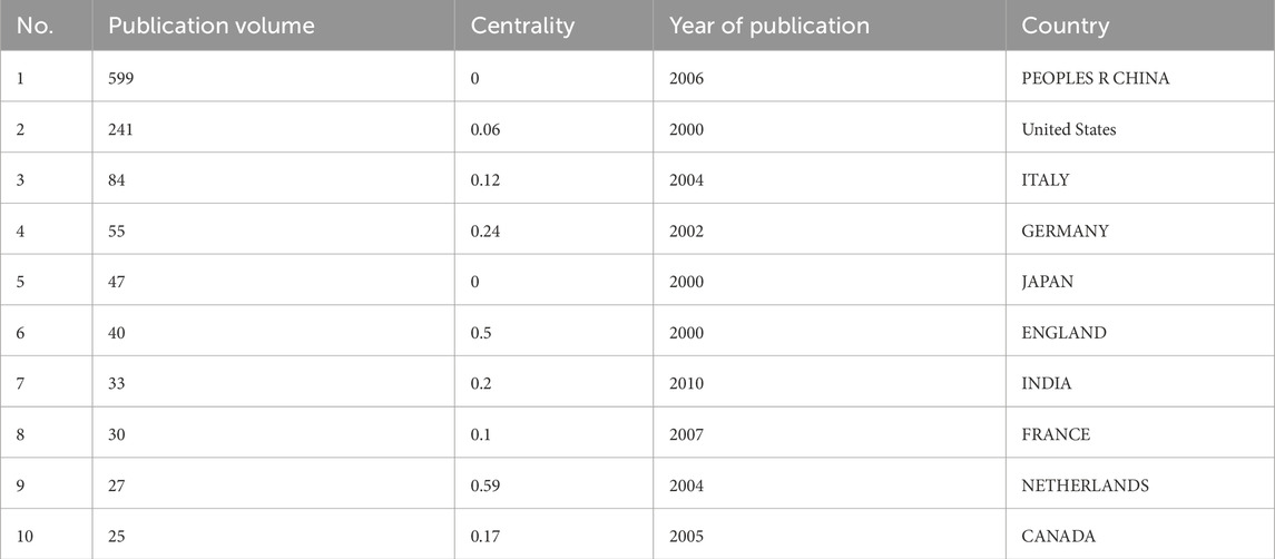 As shown in Figure 3 and detailed in Table 1, China emerged as the most prolific country, accounting for 599 publications since its initial contribution in 2006. This is followed by the United States (n = 241, since 2000) and Italy (n = 84, since 2004). Notably, China has demonstrated a dramatic increase in output, surpassing all other countries by a wide margin after 2018. The United States and Japan showed steady productivity throughout the 2 decades, whereas European countries such as Germany, the United Kingdom, and Italy exhibited moderate but consistent contributions. Countries like India and France entered the field later but have shown growing momentum.