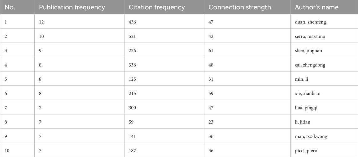 To identify influential researchers and examine collaborative structures in the field, an author co-authorship network and density visualization were constructed using VOSviewer. A total of 791 authors who had published at least two articles were included in the analysis. As shown in Figure 5A, the co-authorship network reveals several well-defined collaborative clusters, with the node size representing the number of publications and the distance between nodes indicating the strength of co-authorship. Notably, Duan Zhenfeng, Serra Massimo, Cai Zhengdong, and Shen Jingnan emerged as central figures in the field, each anchoring a distinct subnetwork of collaboration. The corresponding density map (Figure 5B) further highlights their prominence, with brighter regions reflecting higher publication density and collaborative intensity. According to Table 3, Duan Zhenfeng led the author ranking with 12 publications and a total citation count of 436. Serra Massimo followed with 10 publications but had the highest citation frequency among the top authors (521), suggesting greater influence per article. Shen Jingnan and Cai Zhengdong also showed strong performance, with 9 and 8 publications respectively and high connection strength values (61 and 48), indicating their pivotal roles in shaping collaborative research efforts. The collaborative landscape is characterized by moderate fragmentation, with regional clusters - particularly those led by Chinese and European researchers - tending to collaborate more intensively within their respective networks. This pattern underscores the importance of enhancing interregional collaboration to further diversify perspectives and methodologies in the field. Overall, these findings suggest that a small number of key researchers have driven much of the scholarly output and influence in osteosarcoma metabolomics. Promoting broader and more integrated author collaborations may help to consolidate expertise and accelerate research innovation across institutional and geographic boundaries.