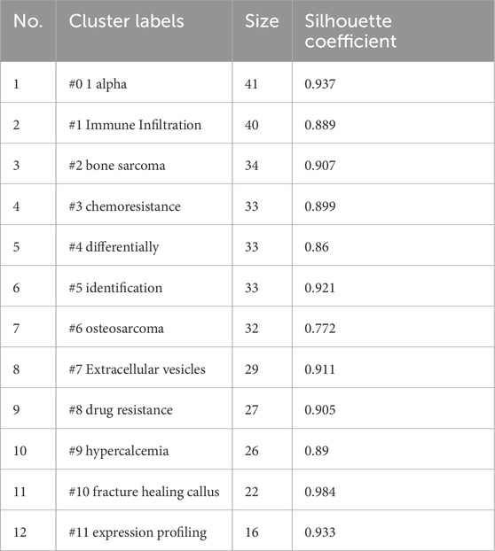 To further clarify the structural composition and developmental trajectory of research topics in the field, keyword co-occurrence clustering analysis was performed using CiteSpace. A total of 12 clusters were identified based on the log-likelihood ratio (LLR) algorithm, and their quality was assessed using the modularity index (Q = 0.765) and silhouette coefficient (S = 0.8924), indicating high clustering reliability and structural validity (Figure 9; Table 5). Each cluster was assigned a representative label based on its most frequent or distinguishing terms. The largest clusters were #0 “1 alpha” (n = 41, S = 0.937), #1 “immune infiltration” (n = 40, S = 0.889), and #2 “bone sarcoma” (n = 34, S = 0.907). Other prominent clusters included #3 “chemoresistance”, #4 “differentially expressed genes”, #7 “extracellular vesicles”, and #8 “drug resistance”, all of which demonstrated strong internal consistency (S > 0.86).