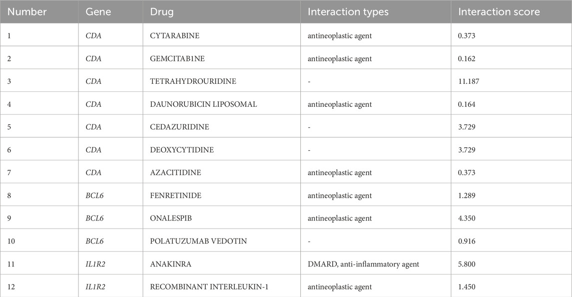 This study identified three hub genes (BCL6, CDA, and IL1R2) by LASSO regression and RF. IL1R2, a member of the IL-1 receptor family, functions as a key mediator of numerous cytokines triggered by immune and inflammatory responses. It plays a crucial role in regulating cellular metabolism and modulating cytokine-induced immune responses (Smith et al., 2004). Several studies have demonstrated the critical role of IL1R2 signaling in the inflammatory process of cardiovascular disease, and Orrem et al. reported that IL1R2, which is mediated by miR-383-3p, inhibits the activation of the inflammatory vesicle signaling pathway, which prevents apoptosis and inflammatory injury in coronary artery endothelial cells (Orrem et al., 2018). Another study reported a significant association between IL1R2 and left ventricular remodeling in patients with ST-segment elevation myocardial infarction (Hanada and Kuramitsu, 1988). These findings suggest that IL1R2 is significantly involved in the pathophysiologic process of AMI. The CDA gene encodes cytidine deaminase, which is involved in the metabolism of the pyrimidine analog gemcitabine. CDA has been used in the past, mainly for the treatment of biliary tract cancer, breast cancer, and other tumors (Iyer et al., 2013). Some current studies have also shown that CDA has high efficacy in treating acute myeloid leukemia, mainly through the PI3K/Akt pathway, which regulates apoptosis and thus influences the disease’s pathological process (Wei et al., 2018). Previous studies have demonstrated that the PI3K/AKT pathway plays a crucial role in AMI by regulating cardiomyocyte activity, angiogenic processes, and inflammatory responses (Ghafouri-Fard et al., 2022). Accordingly, CDA may regulate AMI cardiomyocytes and the process of development through PI3K/Akt; however, further experimental evidence is needed in the future.