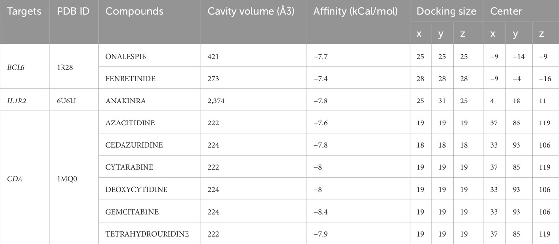 We selected compounds corresponding to three key targets for molecular docking, with the aim of assessing the binding efficacy between the drug’s active compounds and the disease targets. No record of strict matching between recombinant interleukin-1 and daunorubicin liposomal was identified in the PubChem database. In addition, molecular docking could not be completed for polatuzumab vedotin because of its lower docking accuracy with BCL6. The results presented in Table 6 demonstrate that the binding energies ranged between −8.4 and −7.4 kcal/mol, indicating excellent binding activity between the drugs and the three key targets (Figure 12C).