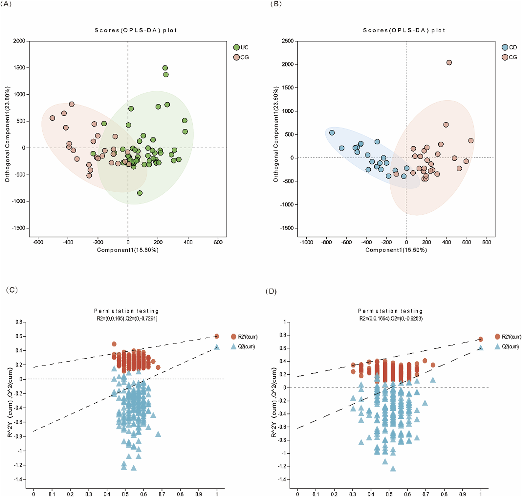 Figure 2. Multivariate statistical analysis of urinary metabolites in IBD patients. (A) OPLS-DA score plot of UC (green dots) vs. CG (pink dots); (B) OPLS-DA score plot of CD (blue dots) vs. CG (pink dots). (C, D) The 200-time permutation plots of two OPLS-DA models, respectively.