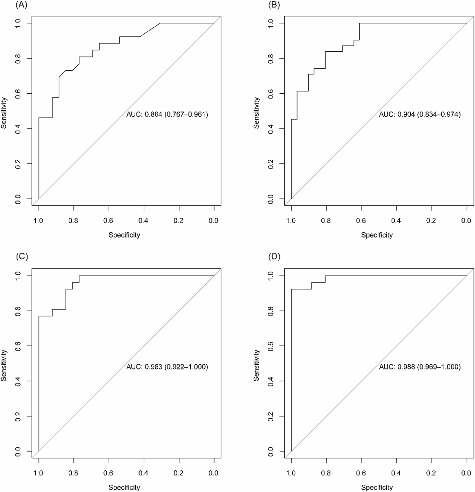 Figure 6. Diagnostic performance of biomarker panels across disease activity levels. (A) ROC curve for identifying UC patients in remission/mild activity vs CG. (B) ROC curve for moderate/severe UC vs CG. (C) ROC curve for CD patients in remission vs CG. (D) ROC curve for active CD vs CG.