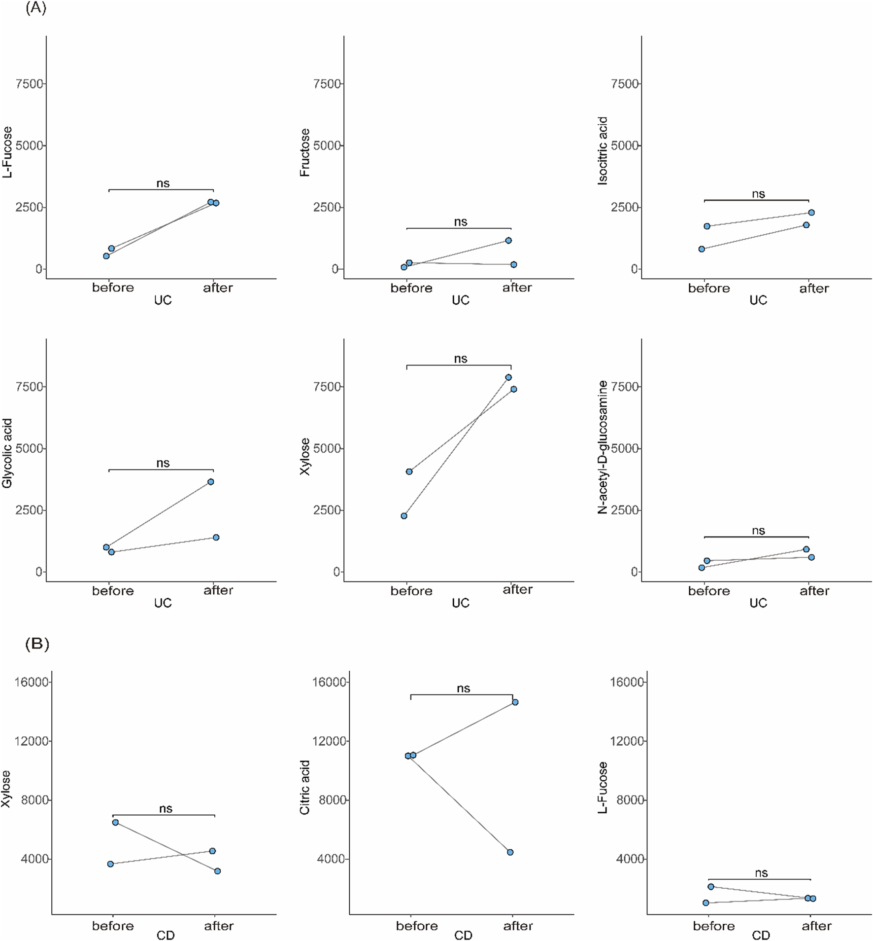 Figure 7. Stability of candidate biomarkers over time. (A) Longitudinal comparison of urinary metabolite levels in UC patients between two time points ≥6 months apart with similar disease activity. (B) Similar analysis in CD patients.