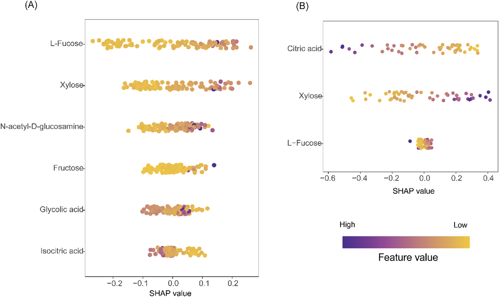 To interpret the contributions of individual metabolites to model predictions, SHAP (Shapley Additive exPlanations) analysis was performed (Lundberg and Lee, 2017). In the RF model for UC, L-fucose, xylose, and GlcNAc were identified as the top predictors, with positive SHAP values indicating higher disease risk (Figure 8A). For CD, citric acid and xylose were most influential in the SVM model, with decreased citric acid and elevated xylose contributing to increased CD probability (Figure 8B). These findings confirm the biological relevance and diagnostic utility of the selected metabolites.