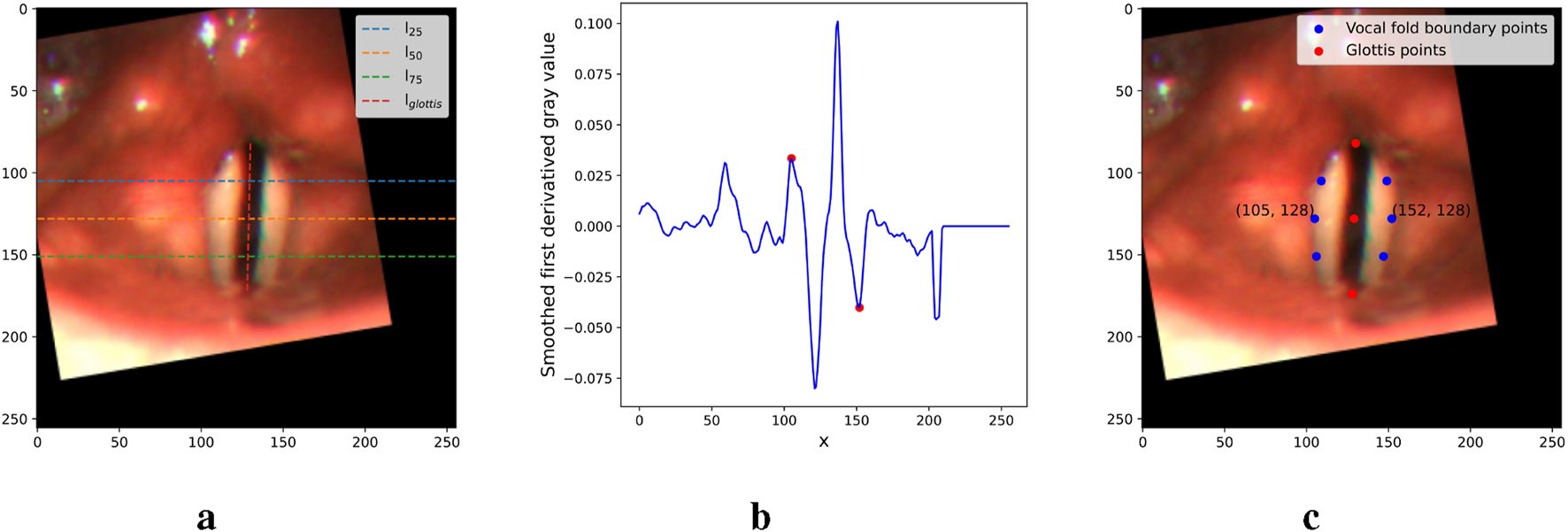 To extract the point prompts, we first connect the top, middle, and bottom points of the glottis with a vertical line, , as shown in Figure 6a. Next, we define three horizontal lines, , , and , which are orthogonal to the vertical line. Specifically, these three lines pass through the three quadrisection points of the vertical line respectively. For each of these lines, we calculate the first derivative of the gray values of the pixels along the line, and we apply a smoothing function to minimize the impact of local extrema. Figure 6b illustrates an example of the smoothed values along . To identify the left and right boundary points of the vocal folds from the plot, we select the first local maximum to the left of the glottis region (corresponding to the left boundary) and the first local minimum to the right of the glottis region (corresponding to the right boundary), as indicated by the two red points in the example plot. This approach works because the gray values increase rapidly from shadow to vocal fold surface on the left boundary, and decrease sharply from surface to shadow on the right boundary. Figure 6c shows the six extracted points along the three horizontal lines in blue, as well as the three glottis points in red. Together, these nine points represent the extracted point prompts.