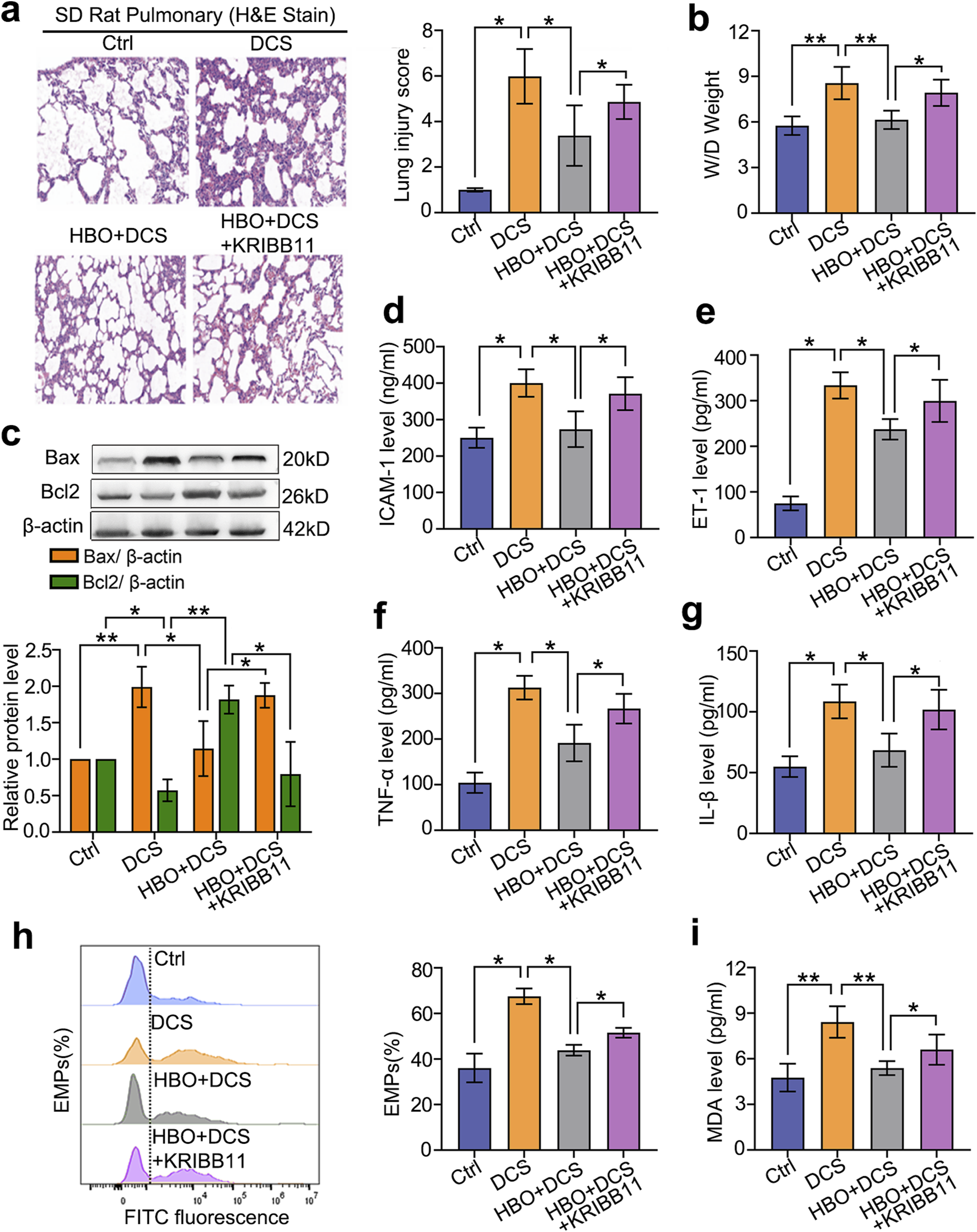 Role of HSF-1 in HBO pretreatment against DCS damage. Rats were treated with the HSF-1 inhibitor KRIBB11 (30 mg/kg) before HBO pretreatment. Subsequently, the DCS model (700 kPa-90 min, 3 min decompression) was established 18 h after HBO pretreatment. (a) H&E-stained lung sections; (b) lung wet-to-dry ratio; (c) apoptotic proteins Bax and Bcl2 levels; (d–i) ICAM-1, ET-1, TNF-α, IL-1β, EMP, and MDA contents in serum. n = 6, *P < 0.05, **P < 0.01.
