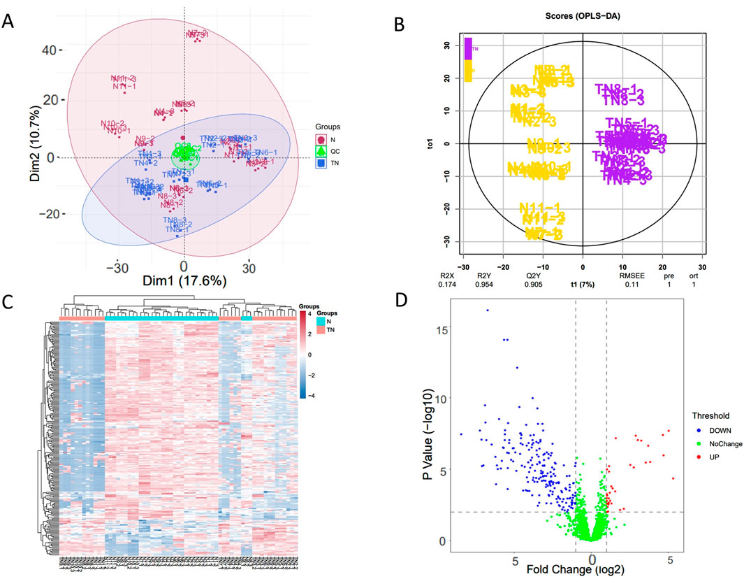 Panel A shows a PCA score plot distinguishing three groups (N, QC, TN) with differentially colored ellipses. Panel B displays an OPLS-DA score plot with groups N and TN. Panel C is a heatmap illustrating hierarchical clustering of groups N and TN, color-coded by expression levels. Panel D is a volcano plot of P value versus fold change, highlighting upregulated, downregulated, and unchanged data points.