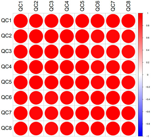 Correlation matrix represented by a grid of red circles with a color scale on the right ranging from blue to red, indicating correlation values from -1 to 1. Both axes are labeled QC1 to QC8.