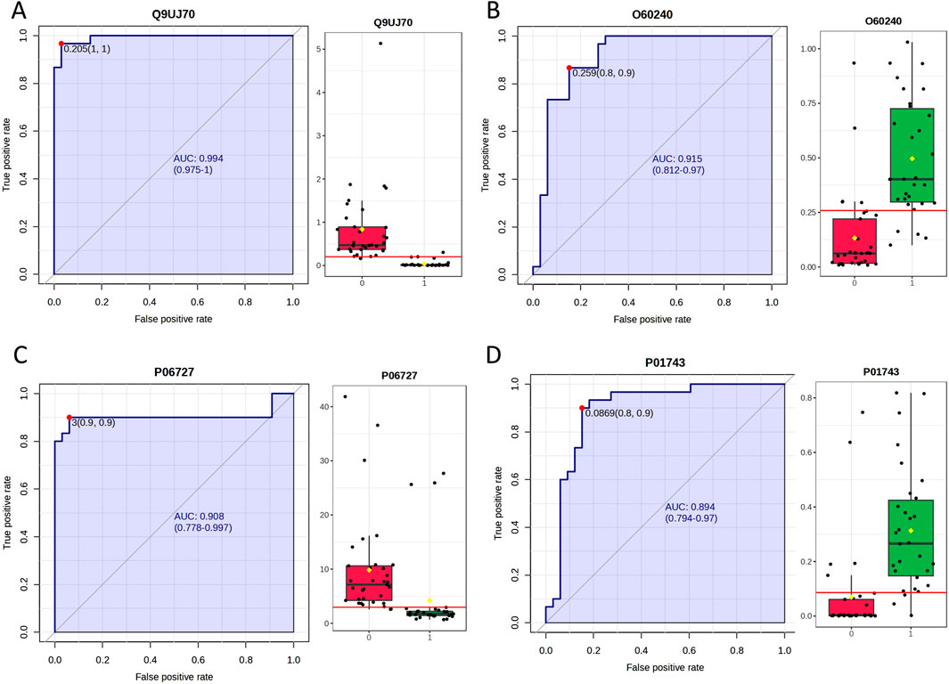 Figure 3. The top 4 AUC values of the significantly changed proteins by individualized analysis. (A) N-acetyl-D-glucosamine kinase (N-acetylglucosamine kinase). (B) Perilipin-1. (C) Apolipoprotein A-IV. (D) Immunoglobulin heavy variable 1–46.