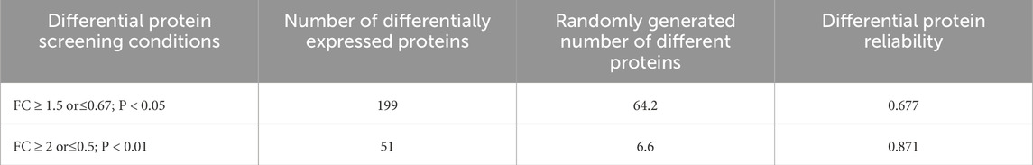 Each sample was performed in triplicate, and all three values were used for statistical analysis. The identified proteins were compared, and differentially expressed proteins were screened. The loose screening criteria for differentially expressed proteins were: fold change (FC) ≥ 1.5 or ≤0.67, and adjusted p-value <0.05 by two-tailed unpaired t-test analysis. The strict screening criteria for differentially expressed proteins were: FC ≥ 2 or ≤0.5, and adjusted p-value <0.01 by two-tailed unpaired t-test analysis. To further evaluate the reliability of differentially expressed proteins, the probability of random generation of differentially expressed proteins was calculated by random grouping using the average value of each protein. All samples were randomly grouped to identify differentially expressed proteins, then the ratio of the differential proteins generated under different random methods to that in the experiment were calculated to evaluate the reliability of the results. Functional enrichment analysis of the screened differentially expressed proteins was performed using the Wukong platform (https://www.omicsolution.org/wkomic/main/), Uniprot website (https://www.uniprot.org/) and DAVID database (https://david.ncifcrf.gov/). The reported literature was retrieved from the Pubmed database (https://pubmed.ncbi.nlm.nih.gov) for functional analysis of differentially expressed proteins.