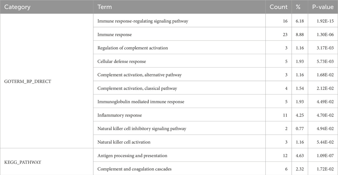 Differentially expressed proteins identified under strict screening conditions were selected for functional analysis. This analysis enriched a total of 44 biological processes and 7 signaling pathways (Supplementary Material), among which ten biological processes and two signaling pathways were related to the immune response (Table 2).