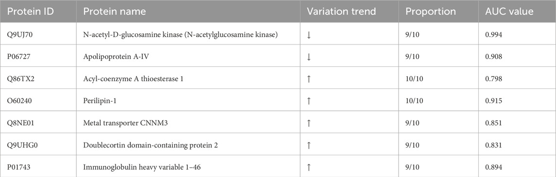 A large number of significantly different proteins were found between the individual urine proteomes of TN patients and healthy controls. This number was much higher than that observed in the grouped protein analysis, further indicating that individual differences are widespread in real-world medical care. Urine proteomics theoretically reflects various changes throughout the body, making it challenging to identify biomarkers for a single disease. If proteins showing similar change patterns are identified among the numerous differentially expressed molecules, the correlation between these proteins and diseases would be strengthened. Therefore, identifying protein molecules with common characteristics through individualized analysis is more reliable. A total of seven high-confidence protein molecules were identified in this experiment, detected in more than eight individuals.