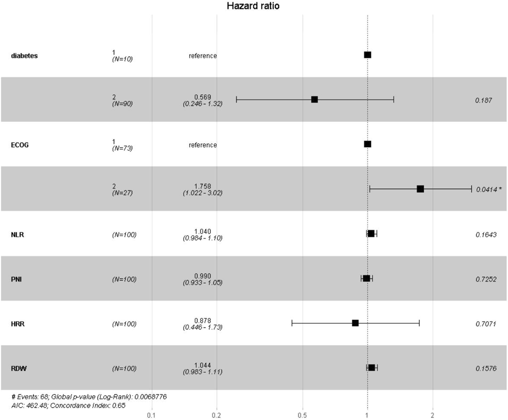 Univariate Cox regression analysis identified nine potential prognostic factors: HIV infection, diabetes, Eastern Cooperative Oncology Group performance status (ECOG PS), NLR, PNI, PLR, HRR, ALB, and RDW. The overall model demonstrated good fit (likelihood ratio test, χ2 = 21.27, p = 0.011). Details are presented in Table 1.