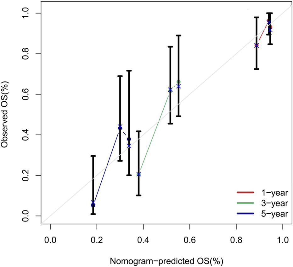 The distribution of continuous variables was assessed using the Shapiro-Wilk test. Variables with a normal distribution are presented as mean ± standard deviation, while non-normally distributed data are reported as median (interquartile range). Categorical variables are summarized as counts and percentages. Between-group differences were evaluated using the chi-squared test for categorical variables, the independent-samples t-test for normally distributed continuous variables, and the Mann-Whitney U test for non-normally distributed continuous variables. Survival curves were generated via the Kaplan-Meier method, with differences between groups compared by the log-rank test. The Cox proportional hazards regression model was employed to assess associations between exposure variables and overall survival (OS). Three hierarchical models were constructed: Model 1 was unadjusted; Model 2 adjusted for demographic factors; Model 3 further adjusted for clinicopathological variables. Variable selection was performed via least absolute shrinkage and selection operator (LASSO) regression. The optimal regularization parameter (λ) was determined using ten-fold cross-validation, applying the one-standard-error rule to enhance model generalizability and minimize the partial likelihood deviance, thereby reducing multicollinearity and overfitting risk. A nomogram was developed based on the selected variables to predict 1, 3, and 5years survival probabilities. Model performance was evaluated by time-dependent receiver operating characteristic (ROC) curves (area under the curve, AUC) and concordance index (C-index). Calibration was assessed by calibration curves using 1,000 bootstrap resamples to compare predicted and observed outcomes. The PowerSurvEpi package was used to calculate statistical power for the Cox regression analyses. Sensitivity analyses, including outlier handling, variable stability, interaction assessment, and threshold adjustment, were conducted to ensure data robustness. All statistical tests were two-sided, and significance was set at P < 0.05. Multiple comparisons were adjusted using Bonferroni correction. All statistical analyses were performed using R software (version 4.3.0).