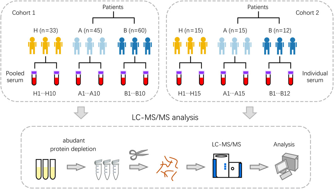 To minimize the inter-individual variation, we performed sample pooling before processing. Three to six individual samples from the same group were pooled to constitute a pool. The sequential precipitation and delipidation method was used for the depletion of high-abundance proteins (Li et al., 2020). A total of 50 μL of water and 250 μL of methyl tert-butyl ether (MTBE) (Sigma, 306975) were added to 50 μL of the pooled serum, followed by vortex mixing. Subsequently, 150 μL of methanol (Merck, 1.06007.4008) was added and the mixture was incubated at 4 °C for 30 min. After incubation, the mixture was centrifuged at 21,000 × g for 30 min at 4 °C, and the supernatant was carefully transferred to a new tube. Then 500 μL of MTBE and 100 μL of water were added. After efficient mixing, the solution separated into two phases. The lower phase was collected and desalted using an HLB SPE column (Waters, 186000383) according to the manufacturer’s instructions.