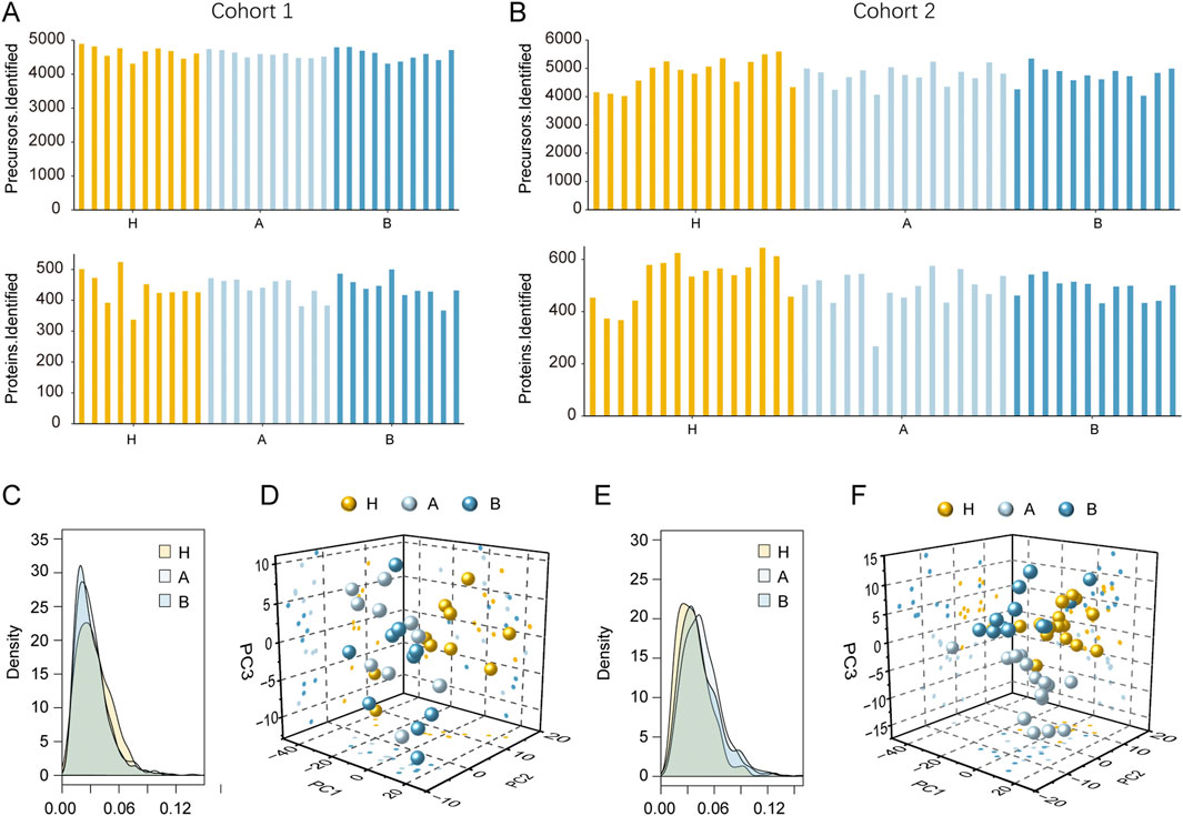 We further evaluated quantitative precision by calculating the coefficient of variation (CV) of protein expression across all samples. Samples H, A, and B showed high measurement precision in both cohorts, with CVs of 3.1%, 2.8%, and 2.7% in cohort 1, and 3.5%, 4.4%, and 3.9% in cohort 2, respectively (Figures 2C,E). These low CV values reflect the high reproducibility of the entire analytical workflow, including sample preparation, data acquisition, and bioinformatic processing. Principal component analysis (PCA) was performed to visualize overall proteomic profiles (Figures 2D,F). Notably, the three groups in cohort 2 showed clearer separation than those in cohort 1, suggesting improved group discrimination in cohort 2. The distribution of MS/MS spectral counts of quantified peptides and the distribution of peptide numbers of quantified proteins are shown in Supplementary Figure S2.