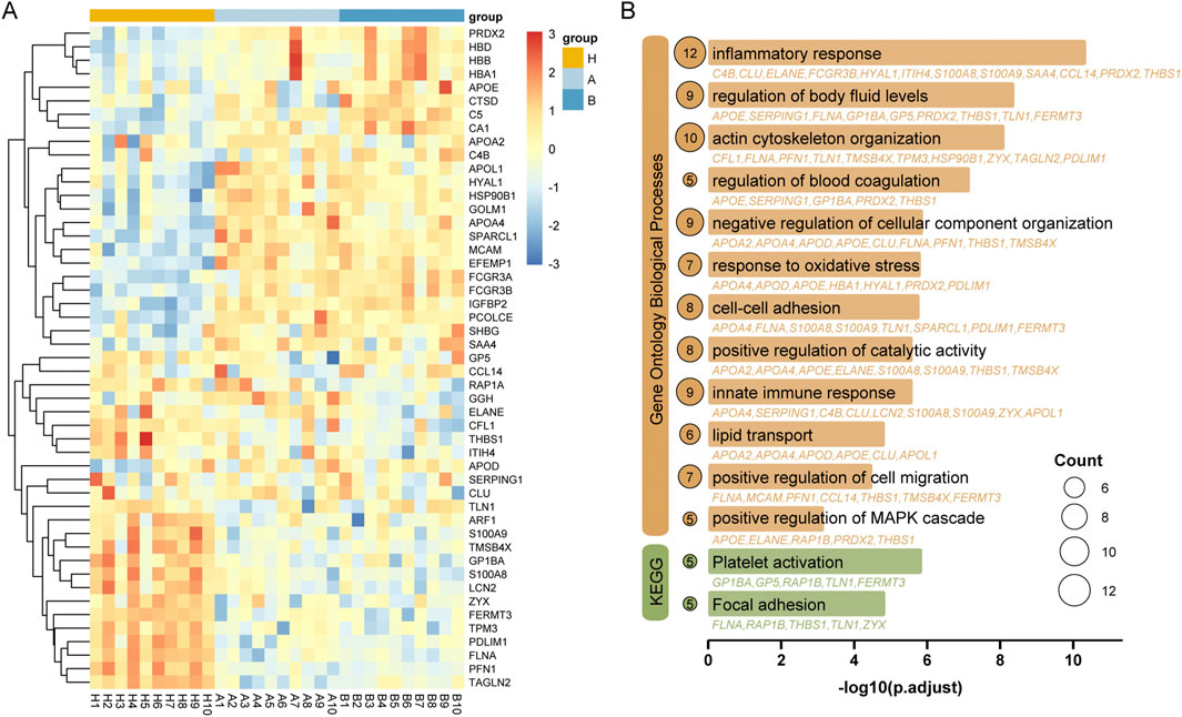 Raw files were analyzed with DIA-NN (version 1.8.1). The spectral library was created using the human proteome downloaded from Uniprot (retrieved in March 2023) with the ‘Deep learning-based spectra and RTs prediction’ enabled. The false discovery rate (FDR) of precursor was set as 1%. Other settings were used as default parameters. Statistical analyses and graphical representations were performed in R (https://www.r-project.org/). All bioinformatics analyses were done with R (https://www.r-project.org/), Origin and Metascape (Zhou et al., 2019). In each experimental group, more than half of the proteins with quantitative values are retained. Missing values are imputed using the KNN algorithm. Batch effects were removed with R package sva from the proteins quantified across both cohort 1 and cohort 2. Principal component analysis (PCA) was performed using the R package factoextra, and results were visualized in Origin. We performed sPLS-DA (KA et al., 2011) and LASSO regression, employing the R packages mixOmics and glmnet, respectively. Receiver operating characteristic (ROC) curve analysis was carried out with the pROC package. Protein abundance was compared using ANOVA test with 5% FDR. P values were adjusted by Benjamini & Hochberg. The data presented in the study are deposited in the iProX repository, accession number PXD 063783.