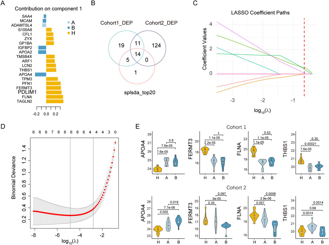 Figure 4. Identification of potential biomarkers for the classification of colorectal adenomas, inflammatory colorectal polyps, and healthy controls. (A) Sparse partial least squares discriminant analysis (sPLS-DA) of serum proteomic profiles. The analysis was performed on the three groups in cohort 1 using proteins quantified in both cohort 1 and cohort 2. The plot displays the top 20 proteins with the highest absolute contribution weights in Component 1. (B) Venn diagram identifying consensus proteins. The diagram compares candidate proteins identified by three independent methods: the top 20 proteins from sPLS-DA (Component 1), differentially expressed proteins (DEPs) in cohort 1 (adjusted p < 0.05), and DEPs in cohort 2 (adjusted p < 0.05). Fourteen proteins were common to all three sets. (C) Feature coefficient profiles in LASSO regression. The coefficient paths for the 14 initial input features are shown across the series of log(λ) values. (D) Parameter selection via ten-fold cross-validation. The optimal λ value was selected using the minimum criterion, as indicated by the vertical dashed line. This procedure resulted in a final model comprising four features with non-zero coefficients. (E) Expression of the four candidate proteins in cohorts 1 and 2. Statistical comparisons of the log2 transformed intensities between groups were performed with Welch’s t-test.