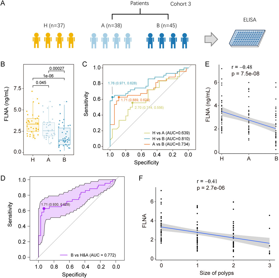 Figure 5. Serological validation of colorectal adenoma biomarkers. (A) Overview of serum sample collection from cohort 3, including H (n = 37), A (n = 38), and B (n = 45). (B) Serum FLNA concentrations in Cohort 3 were quantified via ELISA. Individual data points represent values from single subjects, with boxplot center lines denoting median values. To minimize outlier effects, we excluded maximum and minimum values from each group. Statistical comparisons were performed using unpaired two-sided Wilcoxon test. (C) The ROC curve evaluating the ability of FLNA from serum to differentiate between the three groups. The sensitivity and specificity at the optimal cutoff value are presented. (D) ROC curve with confidence interval of FLNA for the prediction of colorectal adenoma patients from both healthy controls and inflammatory colorectal polyp patients. Association analyses were performed to evaluate (E) the relationship between serum FLNA concentrations and clinical diagnosis, and (F) the correlation between FLNA levels and polyp size. Statistical correlations were assessed using Spearman rank correlation analysis.