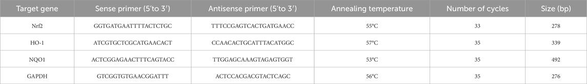 Total RNA was extracted using Trizol (Invitrogen, CA, United States), and cDNA was synthesized from 2 μg of total RNA using the BU-Script RT-Kit (Biouniquer, Jiangsu, China) and stored at −20°C. Reverse transcription was conducted using GoTaq Green Master Mix (Promega, WI, United States). The primers and PCR parameters are shown in Table 2. PCR products were detected through agarose gel electrophoresis. The intensity of the bands was analyzed using the ImageJ program. GAPDH was used as a housekeeping gene.