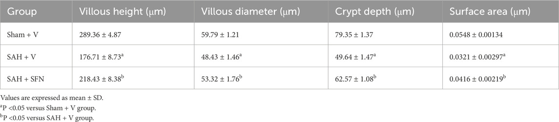 Then, special indices such as villous height, crypt depth, villous diameter, and villous surface area were used to evaluate intestinal mucosal damages. As shown in Table 3, compared with the Sham + V group, all these indices were significantly decreased in the SAH + V group. Notably, SFN remarkably increased these indices. Furthermore, ultrastructural observation was performed to assess the effect of SFN on ileum tissue injury in rats after SAH. The structure of microvilli was all arranged in the Sham + V group (Figures 2A,B). However, some ultrastructural alterations, such as ruptured, distorted, and sparse microvilli, were detected in the SAH + V group (Figure 2C). Moreover, the mitochondria reduced, and their cristae were disrupted (Figure 2D). Following SFN administration, the ultrastructural alterations were dramatically attenuated in the SAH + S group (Figures 2E,F).