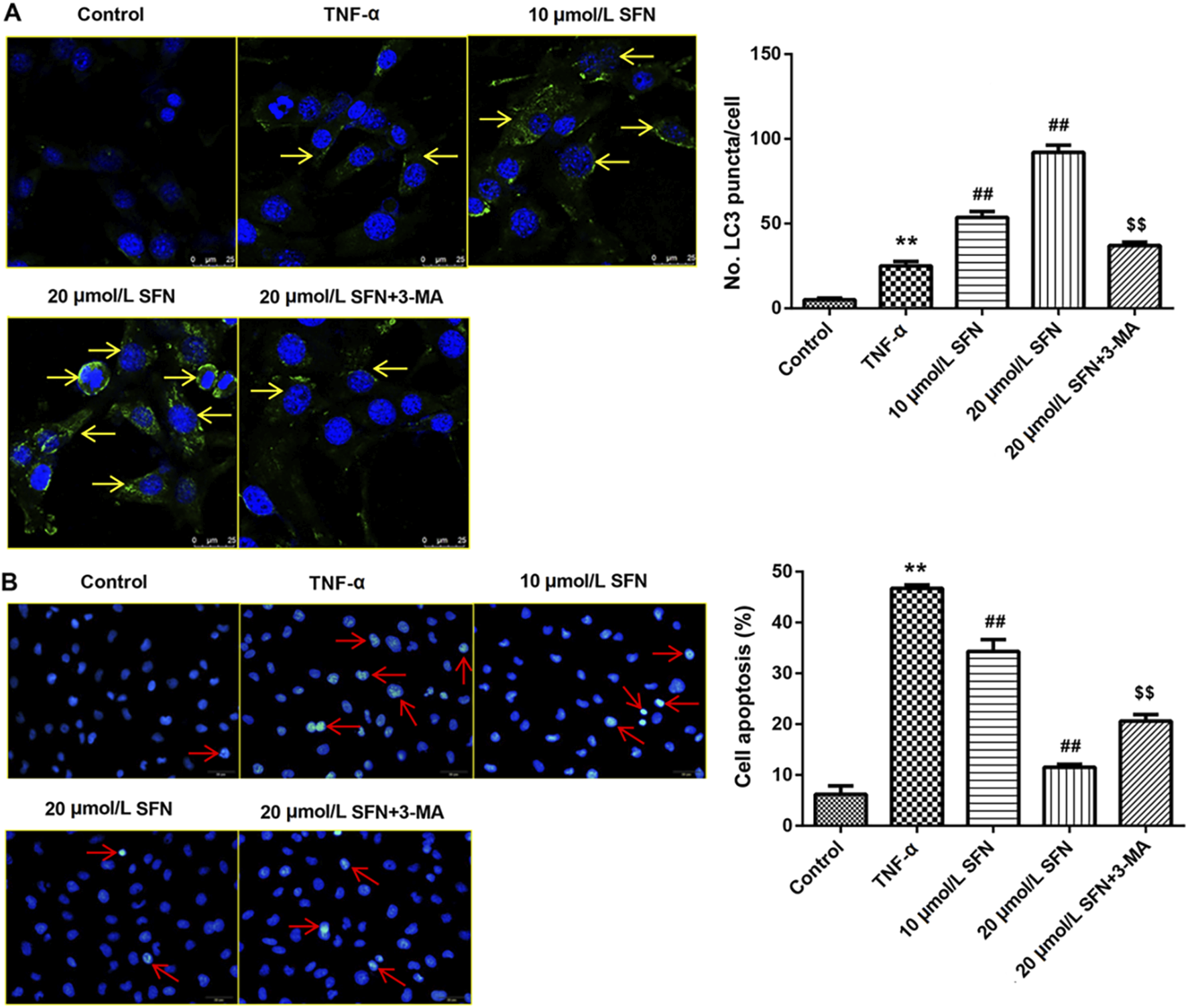 SFN significantly reduced intestinal mucosal epithelial cell apoptosis by activating autophagy (A) Punctate distribution of LC3 was examined through immunofluorescence staining. (B) Cell apoptosis was examined through Hoechst 33258 staining. Data are presented as the mean ± SD. **P < 0.01 vs. control group; ##P < 0.01 vs. TNF-α group; $$P < 0.01 vs. 20 μmol/L SFN group. The yellow arrows indicate the autophagosomes. The red arrows indicate the apoptotic cells.