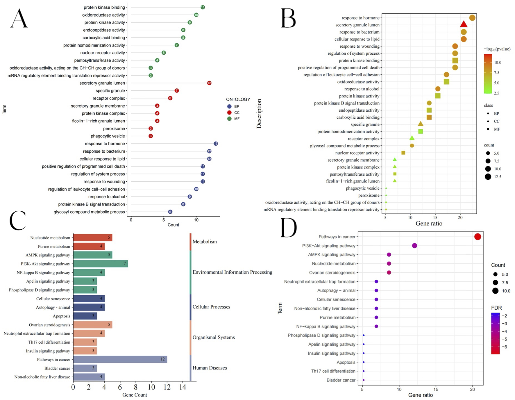 GO and KEGG enrichment analysis results. (A) Lollipop diagram showing the BP, CC, and MF. (B) Bubble chart showing the BP, CC, and MF. (C) The KEGG enrichment analysis bubble chart displaying the top 17 pathways. (D) The top 17 pathways’ KEGG types, as determined by KEGG enrichment analysis.