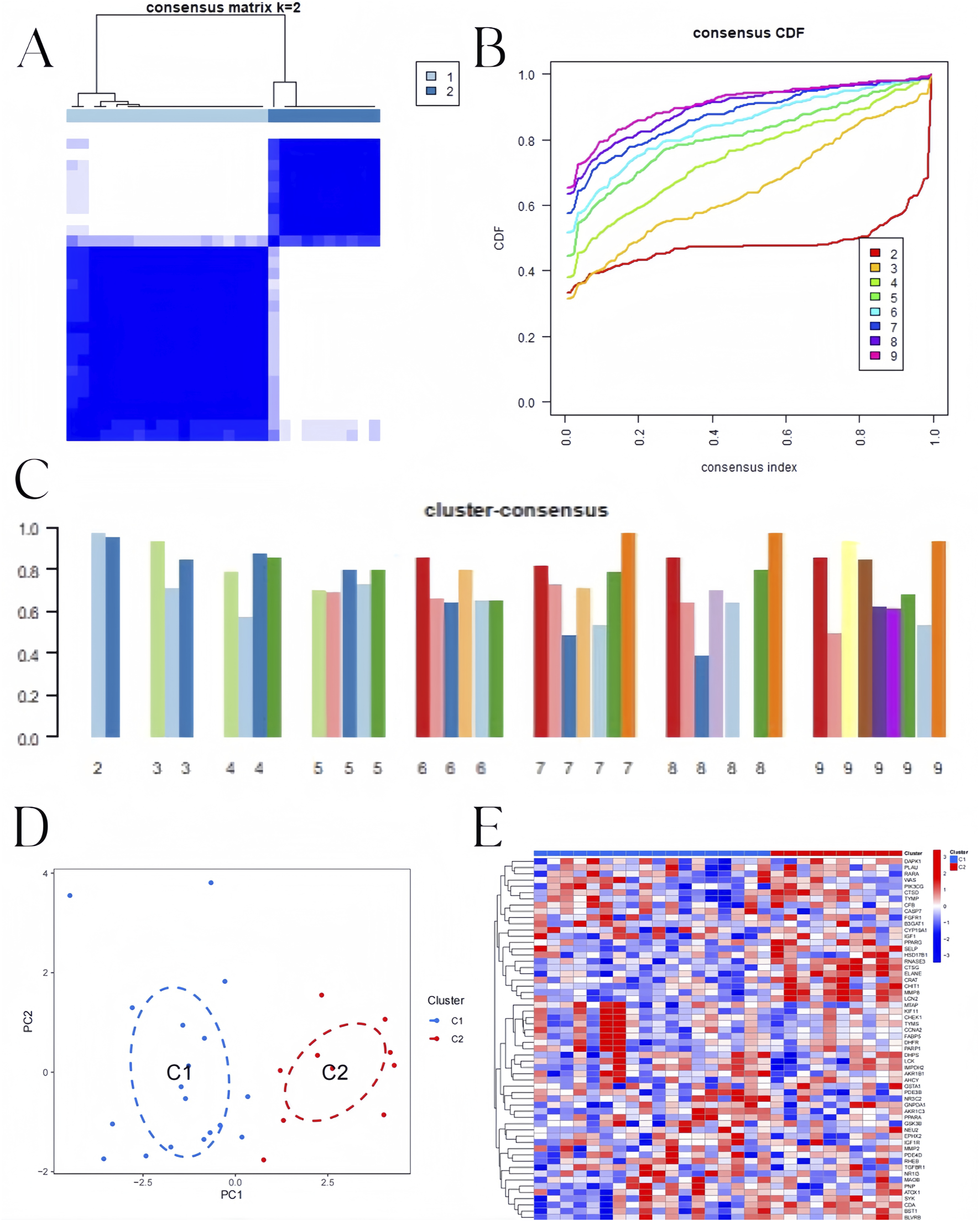 BKN-related clusters in pediatric influenza. (A) Matrix of consensus at k = 2. (B) Cumulative distribution function (CDF). (C) The consensus clustering score. (D) The two subclusters’ distribution in PCA. (E) Heatmap showing the 58 BKN-dysregulated between the two clusters.