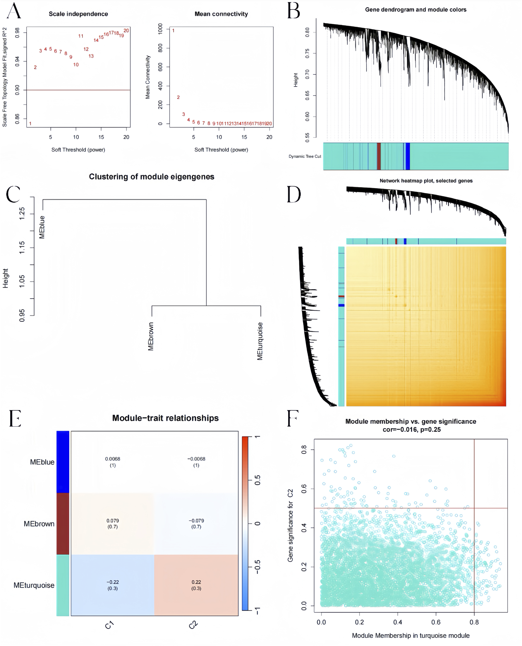 BKN-related molecular clusters’ co-expression network in pediatric influenza. (A) Soft threshold selection. (B) Dendrogram of genes within the co-expression module. Various modules are displayed using various colors. (C) A map of feature genes’ clustering within modules. (D) Correlation heatmap between modules. (E) Module signature gene correlation analysis with clinical traits. (F) Gene significance for pediatric influenza and the turquoise module genes is plotted together in scatter plots.