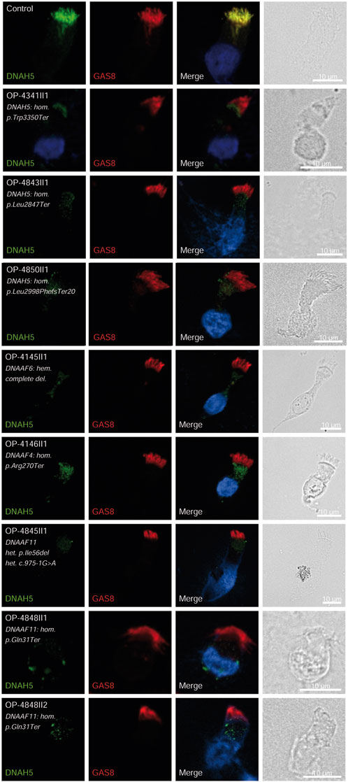 Figure 2. DNAH5 is undetectable in respiratory epithelial cells of individuals with pathogenic variants in DNAH5, DNAAF4 and DNAAF11. Respiratory epithelial cells from control and affected individuals OP-4341II1, OP-4843II1, and OP-4850II1 carrying bi-allelic DNAH5 variants; OP-4145II1 carrying a complete hemizygote deletion in DNAAF6, OP-4146II1 carrying bi-allelic DNAAF4 variants, OP-4845II1, OP-4848II1 and II2 carrying bi-allelic DNAAF11 variants are double-labeled with antibodies directed against DNAH5 (green), and GAS8 (red). Nuclei are stained with Hoechst 33342 (blue). In unaffected controls, DNAH5 localizes to the entire axonemal length. However, in affected individuals, DNAH5 is undetectable, consistent with the pathogenic DNAH5 and DNAAF variants. Scale bars, 10 µm.