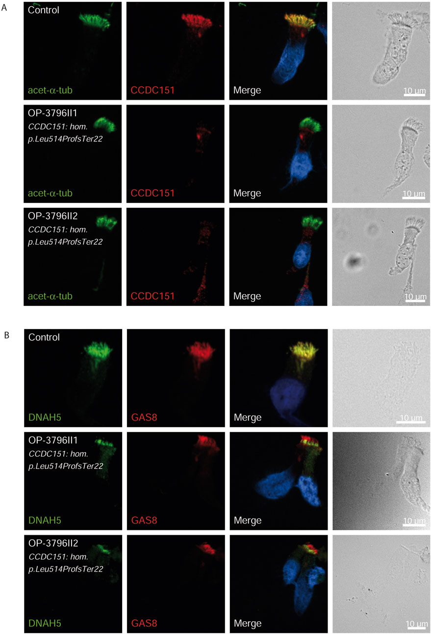 Figure 3. CCDC151/ODAD3 is undetectable and DNAH5 is proximal in respiratory epithelial cells of individuals with pathogenic variants in CCDC151/ODAD3. Respiratory epithelial cells from control and affected individuals OP-3796II1 and II2 carrying bi-allelic CCDC151/ODAD3 variants are double-labeled with antibodies directed against acetylated α tubulin (green), and CCDC151 (red) (A)] and DNAH5 (green), and GAS8 (red) (B). Nuclei are stained with Hoechst 33342 (blue). (A) In unaffected controls, CCDC151 localizes to the entire axonemal length. However, in affected individuals, CCDC151 is undetectable, consistent with the pathogenic DNAAF variants. (B) In unaffected controls, DNAH5 localizes to the entire axonemal length. However, in affected individuals, DNAH5 localizes only to the proximal axonemes. Scale bars, 10 µm.