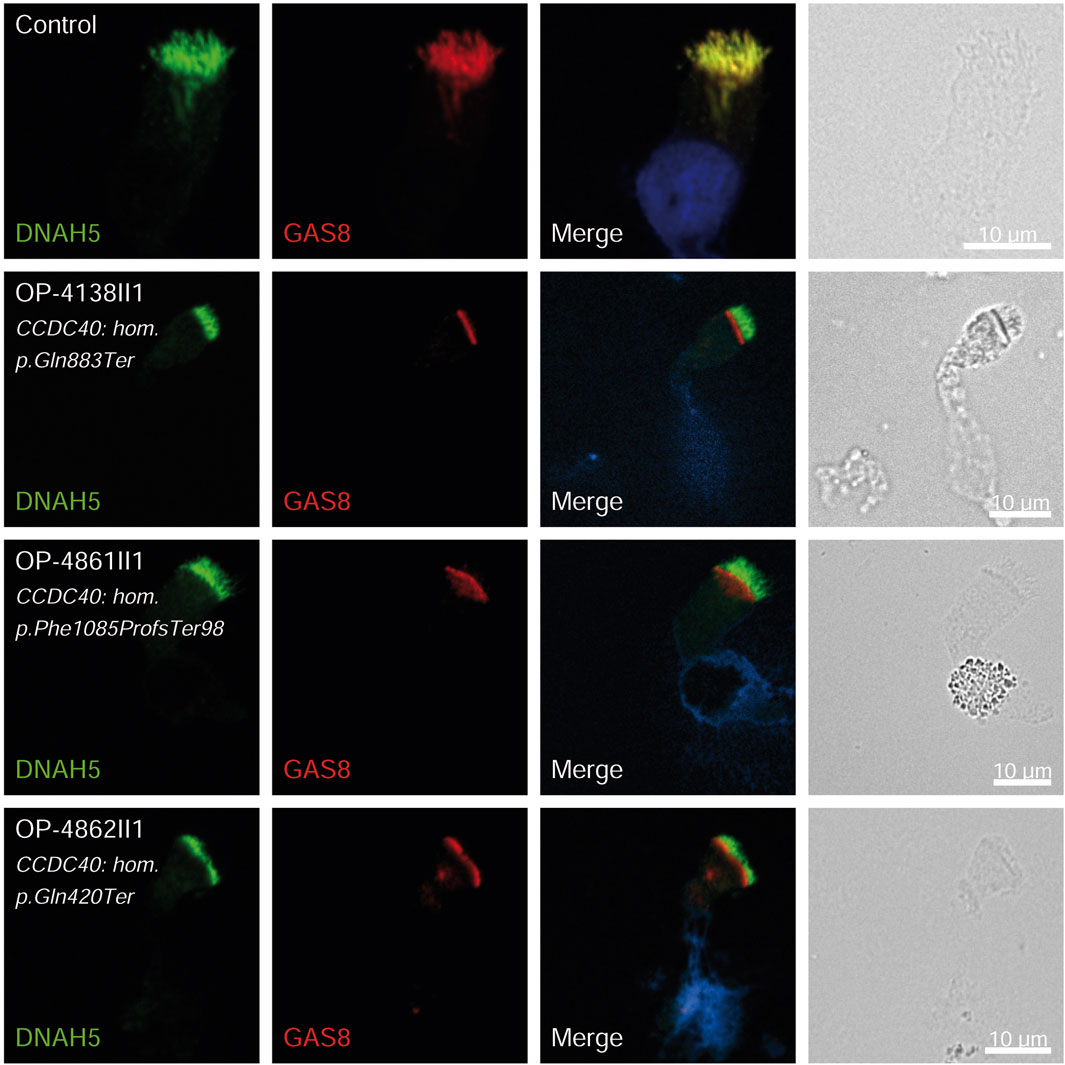Figure 4. GAS8 is undetectable in respiratory epithelial cells of individuals with pathogenic variants in CCDC40. Respiratory epithelial cells from control and affected individuals OP-4138II1, OP-4861II1, and OP-4862II1 carrying bi-allelic CCDC40 variants are double-labeled with antibodies directed against DNAH5 (green), and GAS8 (red). Nuclei are stained with Hoechst 33342 (blue). In unaffected controls, GAS8 localizes to the entire axonemal length. However, in affected individuals, GAS8 is undetectable, consistent with the pathogenic CCDC40 variants. Scale bars, 10 µm.