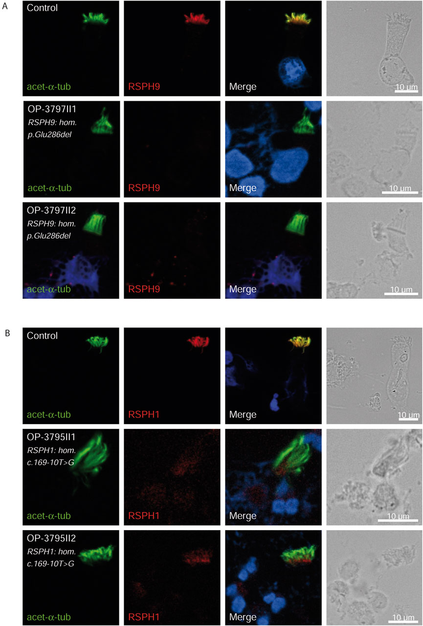 Figure 5. RSPH9 and RSPH1 are undetectable in respiratory epithelial cells of individuals with pathogenic variants in RSPH9 and RSPH1 respectively. Respiratory epithelial cells from control and affected individuals OP-3797II1 and II2 carrying bi-allelic RSPH9 variants, and OP-3795II1 and II2 carrying bi-allelic RSPH1 variants are double-labeled with antibodies directed against acetylated α tubulin (green), and RSPH9 (A), red or RSPH1 (B), red. Nuclei are stained with Hoechst 33342 (blue). In unaffected controls, RSPH9 as well as RSPH1 localize to the entire axonemal length. However, in affected individuals, RSPH9 [A] and RSPH1 [B] are undetectable, consistent with pathogenic RSPH9 and RSPH1 variants. Scale bars, 10 µm.