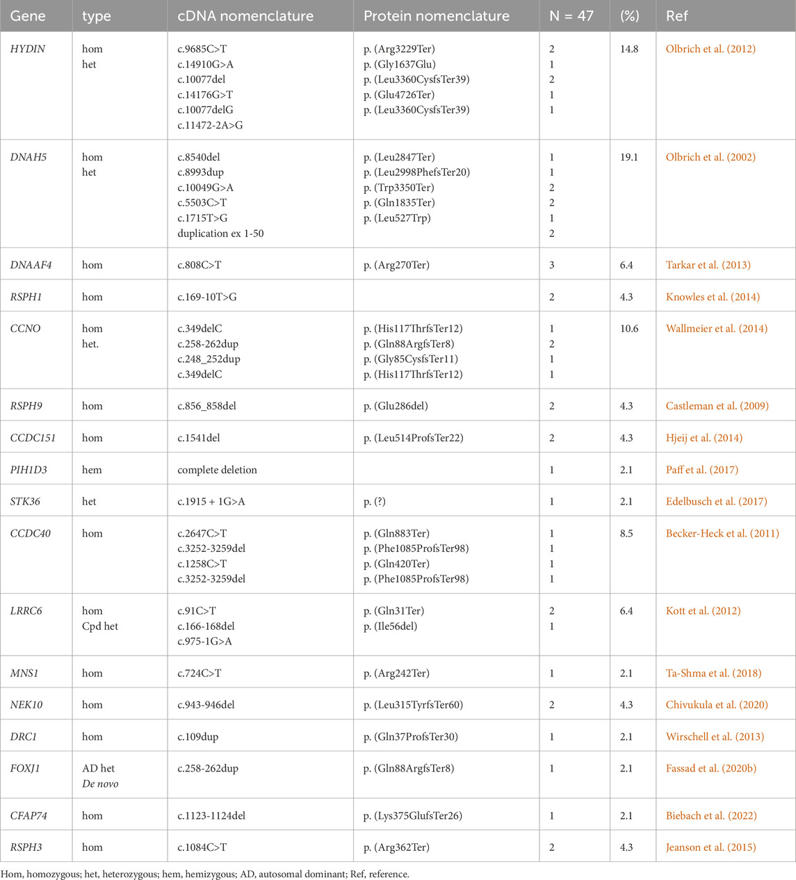 Among the genetic heterogeneity revealed in this Egyptian cohort, we did not identify any homozygous or compound heterozygous variations in DNAH11, DNAI1, RSPH4A, and DNAAF3, reported to be commonly mutated among PCD individuals in previous studies (Zariwala et al., 2006). Despite the genetic heterogeneity underlying PCD, the patient phenotypes reported are largely similar, with few examples of gene- or mutation-specific differences.