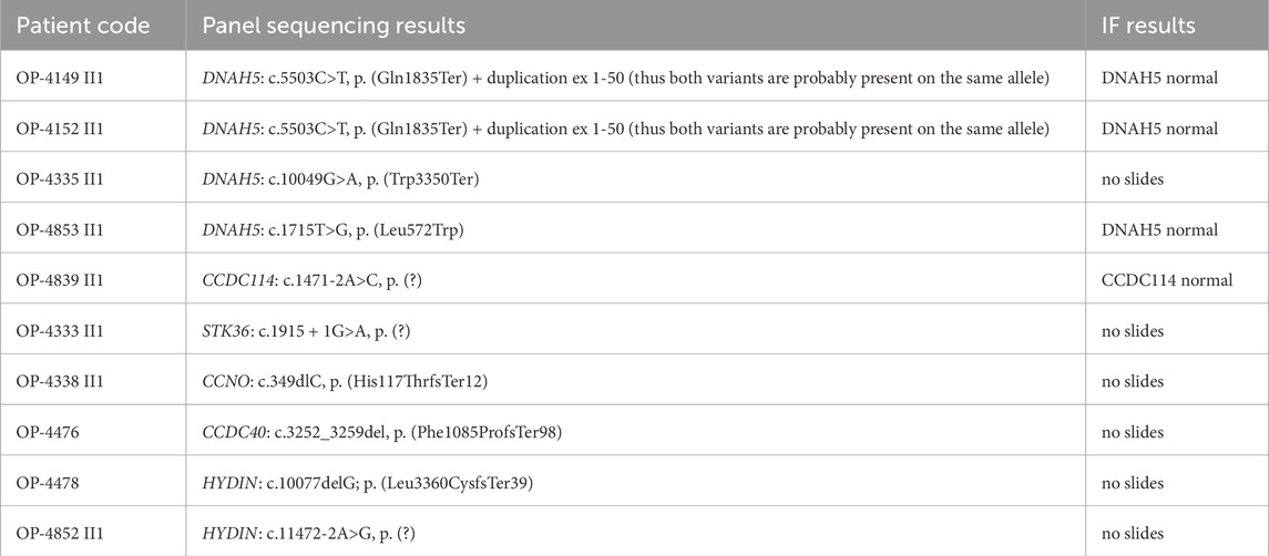 DNAH5 variants, identified in three children (8.1%) were associated with LRTI, chronic rhinitis, chronic sinusitis, and chronic wet cough. One child had neonatal RDS, one had bronchiectasis, and two had situs inversus. Similar findings were reported with DNAH5 variants in 12% of Egyptian PCD-affected individuals (Fassad et al., 2020b). DNAAF4 and DNAAF11 variants in three individuals each (8.1%) resulted in LRTI, chronic wet cough, RDS and situs inversus. The DNAAF4 variant c.808C>T has been previously reported in three individuals in the study by Raidt et al. (2024). One case exhibited PIH1D3 variants, presenting with neonatal RDS, pan-sinusitis, diffuse bronchiectasis, and had undergone a middle lobectomy, matching prior descriptions of X-linked pattern of inheritance (Paff et al., 2017). The pathogenicity of the identified variants in DNAH5, DNAAF4, DNAAF6 (PIH1D3) and DNAAF11 was further confirmed by the absence of DNAH5 from the respiratory axonemes by IF (Figure 2).
